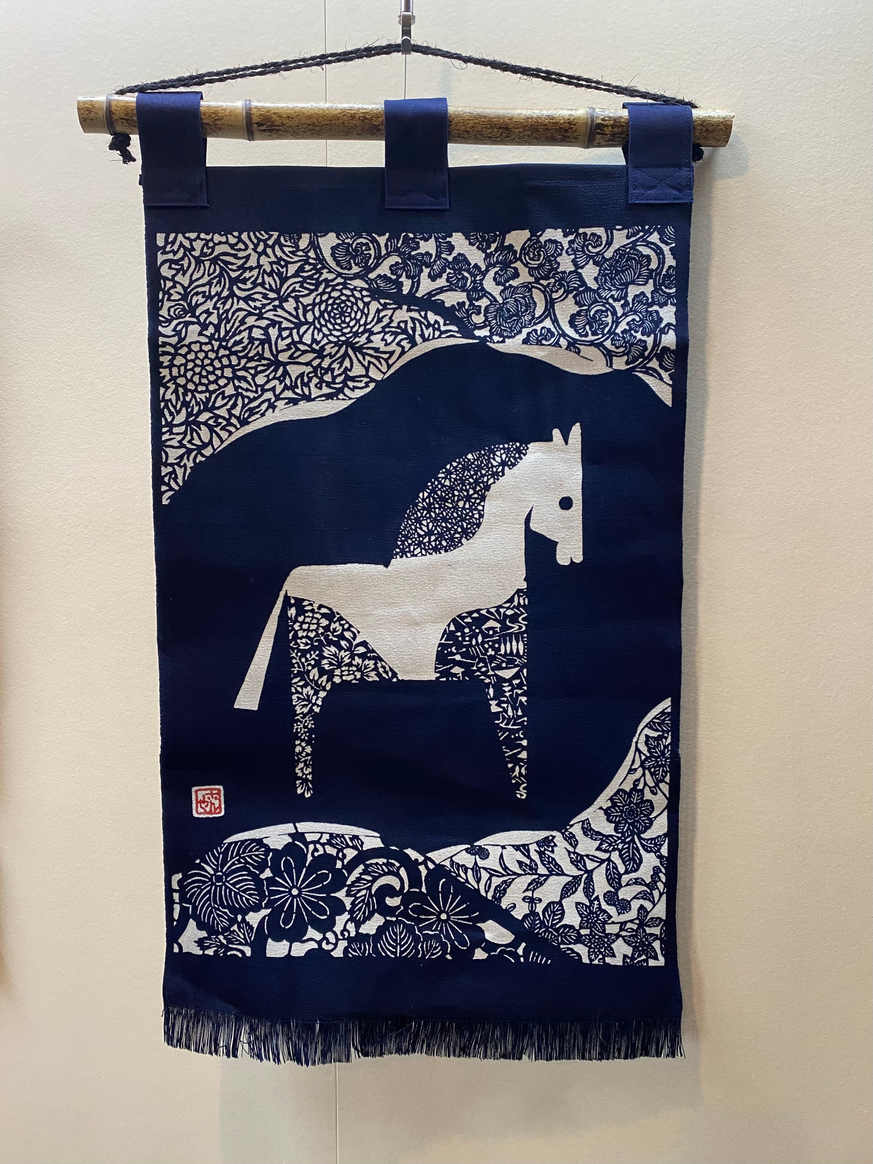 干支藍染タペストリー。 サイズ 約 縦77㎝ 横47㎝ 竹とシュロ縄がついておりますので、届いてすぐ飾れます。 ※お客様の都合による、返品交換、注文後のキャンセルは、受け付けておりません。 また、店舗と並行で販売しておりますので、タイミングによって売り切れの場合もございますので、ご了承下さい。