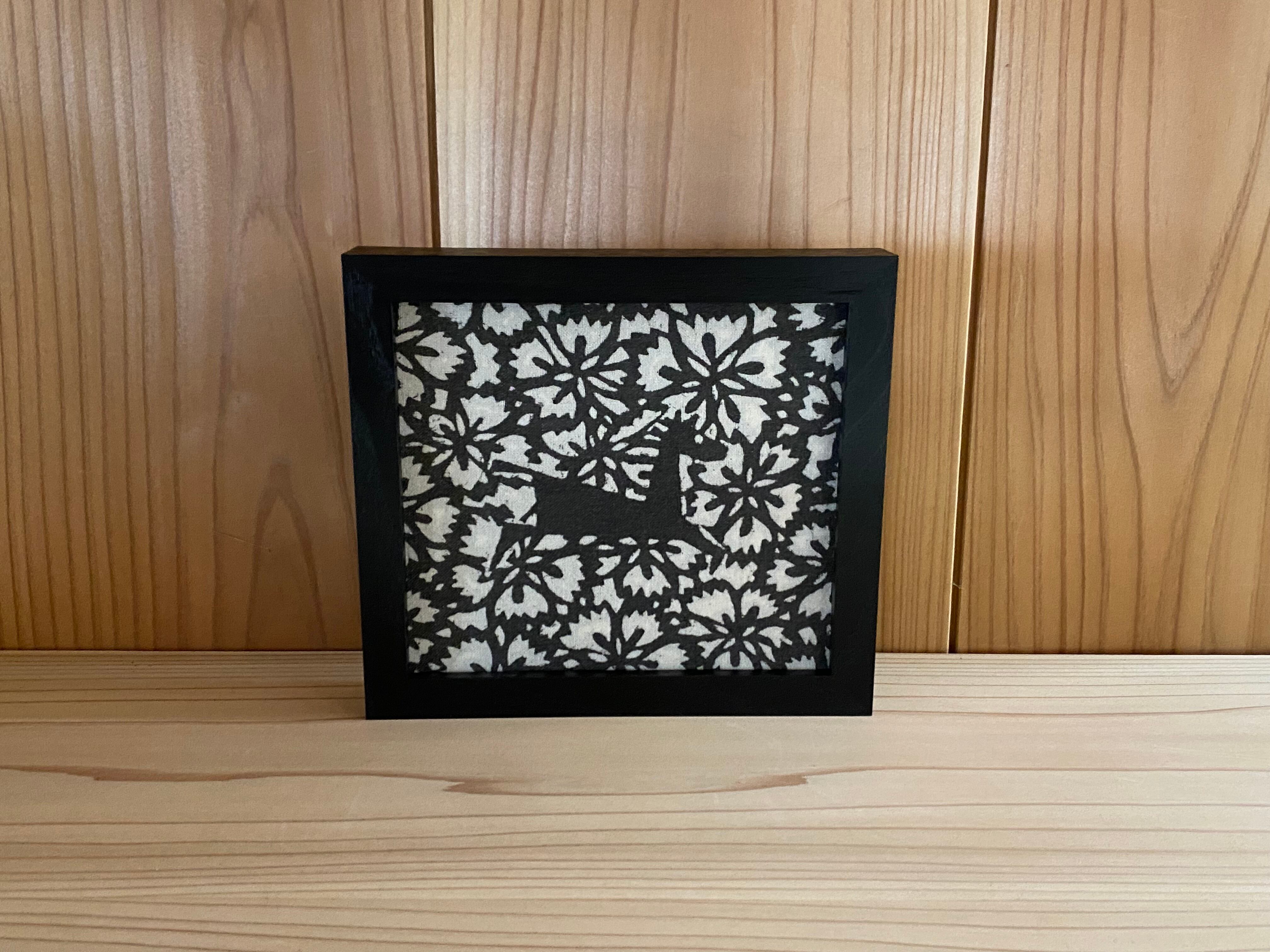 色紙に松煙染の生地を張り合わせた物が額に入っております。